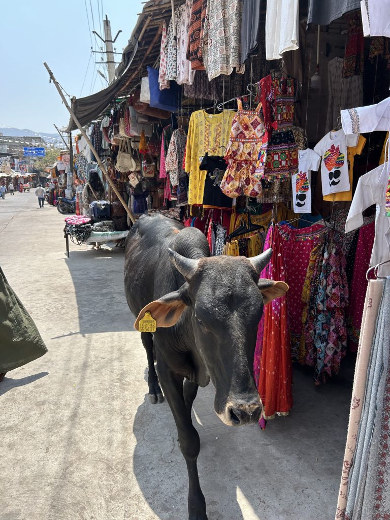 Le mucche sacre sono le vere regine della strada. Camminano indisturbate, si sdraiano in mezzo agli incroci e nessuno osa disturbarle. Sono considerate creature divine, e questo dice molto su quanto la spiritualità sia intrecciata alla vita quotidiana indiana.